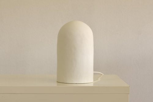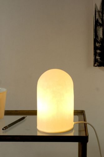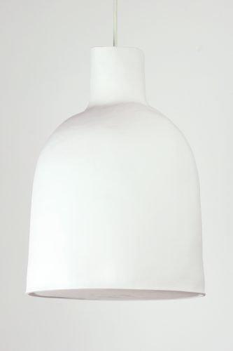De heldere vormen van de lamp zijn geboetseerd. Dit geeft hem zijn karakteristieke, enigszins onregelmatige huid en vorm. Opvallend is ook de gesloten onderzijde, waardoor de lamp in eerste instantie massief en monumentaal lijkt. Dan volgt het onverwachte van de transparantie, waarbij het materiaal tot leven komt door het licht.